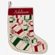 Você vai adorar essa meia de Natal retrô personalizada! Fundo bege com padrão de presentes de Natal vermelhos e verdes. Personalizado com vermelho no topo e o nome de um membro da família.