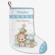 Fofo Natal Azul e Verde Estocando Para o Primeiro Natal do bebê com texto personalizado. Urso bebê de Natal bonito, árvore de Natal, presentes e biscoitos de pão de gengibre. Você pode personalizá-lo com qualquer texto para que você possa usá-lo para um garotinho, não apenas para o primeiro Natal. - Kate Eden Art