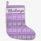 Estocagem personalizada de Natal com um padrão de suéter de malha roxo e lavanda nórdico falso em flocos de neve com um nome na sua escolha de estilo de fonte (mostrado em um roteiro de caligrafia moderno). Escolha entre 2 tamanhos, tecidos diferentes e opções de dois lados na página de pedidos. ASSISTÊNCIA: para obter ajuda sobre modificação ou personalização do design, alteração de cor ou você deseja coordenar itens, entre em contato com o designer ANTES DE ENCOMENDAR, por meio da guia MENSAGEM de Bate-papo Zazzle abaixo ou envie um e-mail para makeitaboutyoustore@gmail.com.