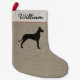 O impressão bonito do tecido assemelha-se ao linho ou à serapilheira com um espaço para adicionar seu nome ou nome do seu cão. Uma meia clássica do Natal do estilo country com uma silhueta de great dane. Todos quer ser uma parte das festividades sazonais e nossos amigos de great dane não são nenhuma exceção. Encha com os brinquedos e os deleites para seu membro da família de quatro patas. Decoração do feriado do amante festivo do cão para a casa ou o escritório. Esta meia do Xmas está disponível em muito mais raças do cão pelo mundo do Doodle de Jenn.