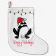 A estocagem de Natal Whimsical apresenta ilustração de sapo preto e branco com chapéu vermelho de Papai Noel, uma sequência de luzes de feriado e texto personalizável de "Feriados Felizes"