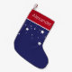 Esta meia azul escura apresenta estrelas brancas penduradas no céu. Uma banda vermelha no topo pode ser personalizada com um nome. Remova o texto usando o botão personalizar para um estoque de Natal sem nome. O armazenamento também está disponível em verde/vermelho e azul/branco. As cores vermelha, branca e azul fazem disso um estoque perfeito para o patriota em sua vida. Design original de K. McIver, ©2020.