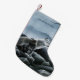 Dois lobos sentados entre rochas fora de um castelo. Montanhas atrás delas.