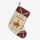 Meia de Natal | Rosto de Unicórnio bonitinho com Anéis de Woodland e decorado com um spray de poinsettias em uma xadrez vermelha de lenhador. Personalizar texto. Toda obra de arte original © pela WhimsicalArtwork™ Esta é parte de uma coleção de feriados coordenada e combinada.