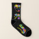Estas meias divertidas apresentam ilustrações de camaleões em um estilo de desenho animado fofo em cores brilhantes e vibrantes sobre um fundo preto.