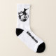 Estas meias de futebol divertidas para mulheres apresentam uma silenciosa jogadora de futebol chutando uma bola de futebol sobre um gráfico de bola de futebol - seu número de camisa na bola de futebol e seu nome são personalizáveis - por katz_d_zynes