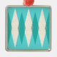 Este Enfeites de natal Moderno de Argyle Meio século apresenta um fundo vibrante e turquesa e um padrão de mod, diamantes teais translúcidos que sobrepõem diamantes maiores, creme de vintage com coloração dourada, salgadinhos da idade espacial. Esse argumento minimalista inspirado e desconstruído é uma reviravolta simplista da era atômica maior que a vida que dominou a paisagem decoradora dos anos 1950 e 1960. Esta design de kitschy lembra tudo, desde os sinais de beco da boliche de Retro Palm Primaveras até as bandejas de televisão que você usou na casa da sua avó.