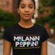 Melanin Poppin! Camiseta gráfica Afrocentrada. Celebre a cultura, a confiança e a expressão vibrante de si mesmo com esta camiseta gráfica ousada "Melanin Poppin!". Projetada com letras brancas marcantes acentuadas em vermelho, azul e amarelo, esta camisa traz energia alegre para qualquer roupa. Formas geométricas acima e abaixo do texto adicionam um toque Afrocentrado que faz o design se destacar na lisa e elegante tecido preto.