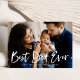 Cartão de dia de os pais bonito e moderno com sua foto favorita da família com "Melhor Pai Nunca" em uma cobertura branca, com letra de pincel. Personalize a frente da placa de dia de os pais adicionando uma saudação personalizada e seus nomes. A placa se reverte para um padrão de xadrez azul e branco.