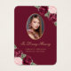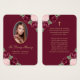 Belo cartão de memória floral vermelho e cor-de-rosa/cartão de oração funerária com uma foto enfeitada com rosas vermelhas cor-de-água rosa e burgundy e o hálito do bebê em um fundo vermelho escuro.