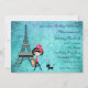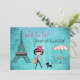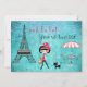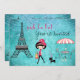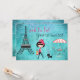 Convite de aniversário de Gato de Paris e Menina Azul Personalizada. Este convite mostra uma garota adorável com seu gato preto em Paris com a torre Eiffel e uma mesa de café. Alguns gráficos de Origins Digital Curio em www.etsy.com/shop/OriginsDigitalCurio.