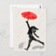 Garota brincando na chuva com um guarda-chuva vermelho.
