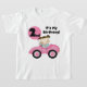Uma menina com um balão cor-de-rosa em um convertible cor-de-rosa na menina em t-shirt do segundo aniversário do carro, em cartões, em etiquetas, em ímãs, em umas sacolas, em botões do segundo aniversário, e em mais cor-de-rosa.
