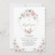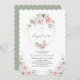 Este batismo feminino apresenta romântica cor d'água rosas rosa pinceladas, verde-claro empoeirado e coroa ouro elegante. O reverso deste convite é verde pastel empoeirado. Aproveite!