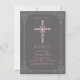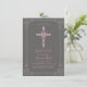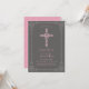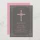 Este convite para o Batismo da na moda e a menina moderna ou para o Christening de 4,5" x 6,25" apresenta uma elegante cruz rosa com uma fronteira coordenadora. As cores de fundo na frente e no verso, assim como o texto, podem ser personalizadas para sua ocasião religiosa especial.