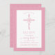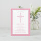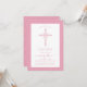 Este convite para na moda e petite moderno (4,5" x 6,25"), Batismo ou Christening, de menina, apresenta uma elegante cruz rosa com uma fronteira rosa coordenada. As cores de fundo na frente e no verso, assim como o texto, podem ser personalizadas para sua ocasião religiosa especial.