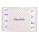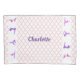 Monogrammed, um travesseiro com tema de ginástica, cor-de-rosa e púrpura- O padrão de latência de quatrefoil em cor-de-rosa sobre fundo branco. Lados adorados com tiras brancas com ícones de ginástica de menina rosa e roxo. Adicionar nome personalizado em script roxo no centro. Presente único e personalizado para ginastas. Bonito para a decoração do quarto. Temos presentes de ginástica, coordenadores, cor-de-rosa, assim como presentes de ginástica personalizados em nosso compro Zazzle.com/angela65*.