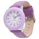 Crianças de arte gráfica assistem apresentando uma simples borboleta roxa em um fundo branco. Excelente para garotas em idade escolar aprendendo a ler um relógio como mostra os números de minutos e horas em roxo claro. Personalize com o nome do seu filho, o exemplo lê Hannah.