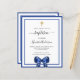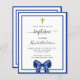 Um convite moderno, elegante e batismo. Um fundo branco decorado com quadros azuis reais e arco. Personalize e adicione um nome e detalhes. Letras pretas coloridas.