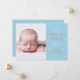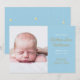 Cartão de nascimento moderno em dourado para menino, cartão de anúncio de nascimento para apresentar o seu lindo bebé recém-nascido. A frente apresenta uma foto do seu bebé juntamente com texto dourado e branco para o nome e dados de nascimento do seu bebé num painel azul que pode personalizar para a cor da sua escolha. O verso tem estrelas douradas em cordas num fundo azul correspondente. Concebido por Thisisnotme©