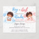 Menino ou sexo feminino revelam convite para o orçamento do partido. Tradicional, rosa e azul, garotinho bonitinho e bebê sentados em uma nuvem, abraçando o coração com balões.