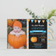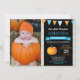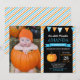 Convite de Aniversário do Rapaz Pumpkin com fotografia personalizada. O Pequeno Aniversário Da Pumpkin Fall. 1rua Primeiro Aniversário. Listras laranja e azul, fundo do quadro.