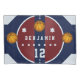 Um presente personalizado e único para o seu bravo com o menino de basquetebol ou filho adolescente ou neto, sobrinho, afilhado etc... Um cobrir personalizado de duvet com uma quadra de basquete, bolas de basquete e estrelas que você pode personalizar com o nome da sua própria super estrela, assim como o número da sua camiseta. Esquema de cor vermelho, branco e azul. Excelente aniversário ou presente de Natal para um rapaz, adolescente ou adolescente. * Mockup por Alexander Cho para Freepik.