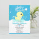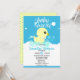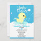 Chá de fraldas de borracha branca para rapazes com um pato de borracha amarelo e um fundo azul e branco. Personalize com seus detalhes de chá usando nosso modelo fácil.