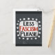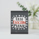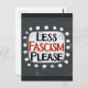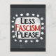 "Menos fascismo por favor" é um design de texto bonito em cinzas com texto preto e vermelho, junto com uma forma de sotaque branco e pontos brancos texturizados ao seu redor.