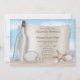 Convites para casamento em praia, exclusivamente projetados por Artisticamente Convidado, com uma ilustração em garrafa de vidro com um design de mensagem de papel tachado na areia, completo com conchas, dólares de areia e uma estrela-do-mar. Seus detalhes personalizados de casamento são impressos em castanho sobre a ilustração em papel. Estes são os convites perfeitos para as comemorações do casamento temático da sua praia.
