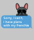 Esta camisola engraçada apresenta um bonito e azul, buldogue francês, com uma mensagem de texto que diz "Desculpe, não posso, tenho planos com minha frenchida." Esta camisola fofa também está disponível com diferentes Buldogues franceses de cor diferente em designs masculinos e femininos.