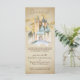 Este menu personalizado apresenta uma Beleza mágica e encantadora e o tema conto de fadas da Besta. O fundo é um design de papel de pergaminho rústico, de aparência antiga. Uma imagem de um estilo aquoso, um castelo clássico de conto de fadas é colocado perto do centro, acentuado com um padrão de tinta dourada. A saudação Seja nosso convidado é impressa no topo em uma bela fonte de script. É perfeito para um brunch, jante, ou outra ocasião mágica.