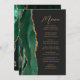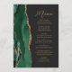 Este elegante cardápio de casamento moderno apresenta uma borda de ágata em aquarela esmeralda verde aparada com brilho dourado falso. O texto personalizável combina script de escrita à mão em cor dourada e fontes sans serif em um fundo preto claro. O design de ágata verde e dourado é repetido no verso.