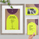 Arcos amarelos neon e de ameixa sobre estoque de papelão inspiraram fundo. Monograma no topo sobre arca de ameixa. Texto preto sobre arco amarelo com flor de arte de linha preta à esquerda.
