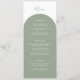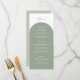 Apresente o jantar de recepção com este elegante cartão de menu boêmio, projetado para combinar com a Coleção de Casamento Arco Rústico Verde Salvia, oferecendo uma nova perspectiva ao visual característico. A frente apresenta uma simples curva de arco verde claro que emoldura graciosamente os detalhes da refeição, incluindo aperitivos, opções de prato principal e sobremesas, tudo sobre um fundo branco marfim. Design retrô. Essa variação sutil cria um pano de fundo rico e natural que permite que as informações do menu sejam o centro das atenções.