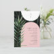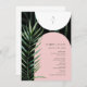 Arcos cor-de-rosa e brancos embebidos sobre o fundo da folha de palma escura. Monograma vertical no topo sobre o arco branco. Texto da cinza sobre o arco cor-de-rosa com folha de palma de aquarela à esquerda.