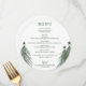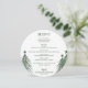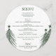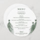 Menu de jantar redondo elegante com árvores de Natal apresenta os detalhes do seu menu em letras elegantes. Perfeito para uma festa de Natal ou qualquer evento especial com jantar sentado.