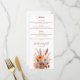 Personalize um menu de tema boêmico para o seu casamento com este Menu de Casamento Floral do Autumn Boho. Design de menu apresenta um buquê floral de cor d'água feminina em cores quentes do outono. Matando papelaria de casamento disponível com esta design também.