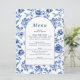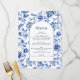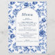 Elevem sua recepção de casamento com este elegante menu botânico, projetado para complementar uma celebração clássica e eterno. A sofisticada borda floral em quadros azuis profundos o texto central, oferecendo uma apresentação graciosa e refinada para seus convidados. Com um design de fundo inspirado na pintura creme, traz um toque de encanto do mundo antigo para sua celebração moderna. Perfeito para adicionar uma camada extra de beleza à sua configuração de mesa, este menu orienta os seus convidados através dos cursos deliciosos planejados para o seu grande dia. Ideal para casais que procuram uma elegante estética tradicional para o seu casamento.
