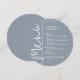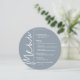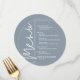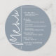 Um cartão de menu de jantar azul empoeirado redondo apresenta suas opções de menu em letras brancas elegantes, perfeito para um casamento moderno, jantar de ensaio de casamento, festa de aniversário ou qualquer evento especial com jantar sentado. Personalize facilmente com o seu menu de jantar e detalhes. MAIS cores em nossa loja.