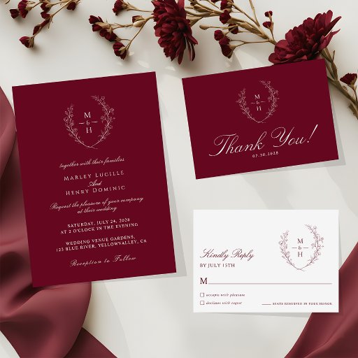 This monogram wedding dinner menu features a burgundy typography and white background with refined boho botanical wreath. A classic monogram adds a formal touch, while the clean layout presents the menu clearly. The design feels warm, stylish, and easy to read.