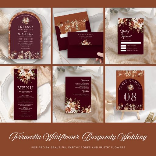 Menu Boho Terracotta Floral Wildflower Burgundy Casamen