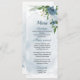 lindas flores azuis e brancas e verdes deixam cardápio romântico de casamento.