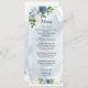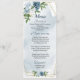 lindas flores azuis e brancas e verdes deixam cardápio romântico de casamento.