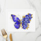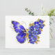 Borboleta de flores cinza, azul, safira, espumante com asa decorada com flores preciosos azuis com folhas de ouro sobre fundo branco.