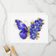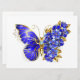 Borboleta de flores cinza, azul, safira, espumante com asa decorada com flores preciosos azuis com folhas de ouro sobre fundo branco.