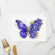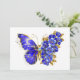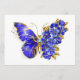Joias, azul, safira, borboleta flor cintilante com asa decorada com flores azuis preciosas com folhas de ouro sobre fundo branco.