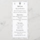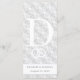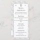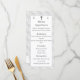 O design apresenta a aparência do local branco como plano de fundo para as opções de menu personalizáveis. O monograma das primeiras iniciais de noiva e noiva é apresentado no topo de cada lado de uma cruz prateada. O texto é exibido contra um suporte branco, o lado inverso exibe o primeiro sobrenome inicial do casal em uma fonte branca grande. Os nomes do casal e da data do casamento são mostrados abaixo. Muito elegante. Projetado para coordenar com a coleção de Suite Casado Monograma Católico de Lace Branco.