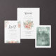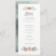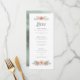 Adicione um menu atraente à decoração da mesa com uma fonte decorativa exclusiva que dispara um buquê de aquarela em pastéis moles de rosa pincelado a coral pálido. O inverso tem um fundo de aquarela moderno em coordenação de tons verdes sábios junto com suas iniciais e data do casamento. Estes menus de casamento são perfeitos para casamentos de jardim. Procure ID654 para ver o conjunto de casamento correspondente.