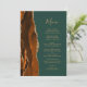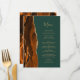The left-hand edge of this elegant modern wedding menu features a watercolor agate border in shades of rust and burnt orange, trimmed with faux gold glitter. The customizable text combines gold-colored handwriting script and copperplate fonts on a dark green background. The reverse side features a matching rust and gold agate design.